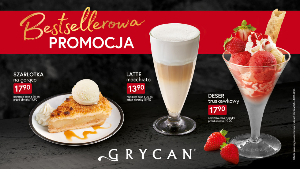 Oferta obowiązuje od 26.02.2025 do 08.04.2025 Uwielbiany przez Gości Deser Truskawkowy, wyborne Latte Macchiato i delikatna Szarlotka na gorąco z lodami waniliowymi dostępne są teraz w lodziarnio-kawiarniach GRYCAN w bardzo atrakcyjnych cenach! Aktualna promocja obowiązująca do 8 kwietnia to doskonała okazja, aby spróbować tych bestsellerowych pozycji z menu lodziarnio-kawiarni. Serdecznie polecamy!