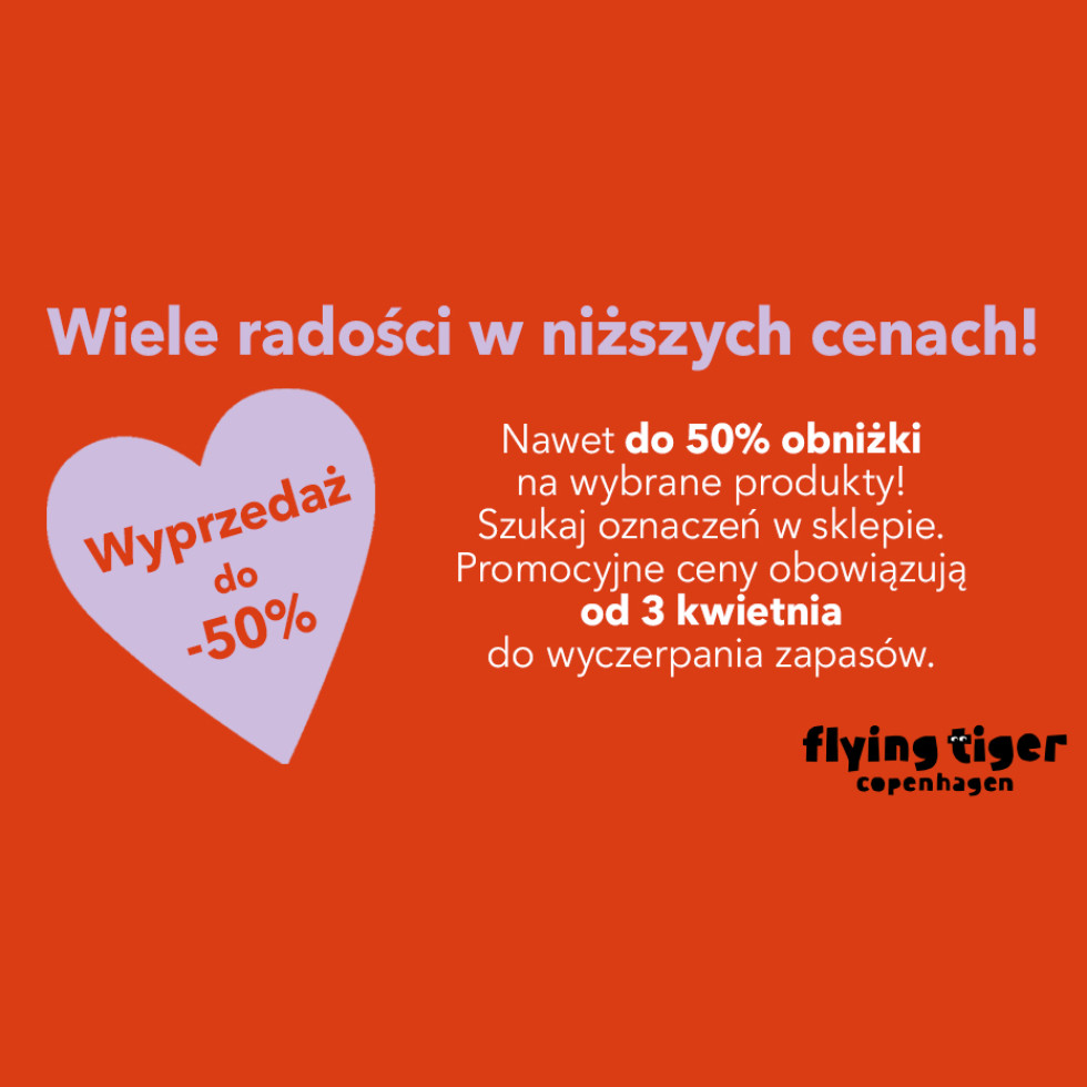 Wiele radości… w niższych cenach!  We Flying TigerCopenhagen ruszyła wyprzedaż, która ucieszy nie tylko twój portfel! Nawet do -50% na wybrane produkty!   Od praktycznych gadżetów, przez kreatywne dodatki, aż po prezenty z przymrużeniem oka – teraz możesz upolować swoje ulubione rzeczy w świetnych cenach.  Promocyjne ceny obowiązują od 3 kwietnia do wyczerpania zapasów.