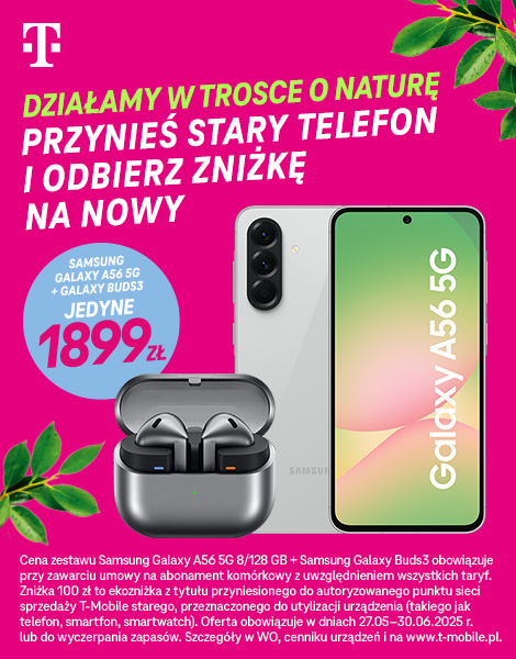 Działamy w trosce o naturę. Przynieś stary telefon i odbierz zniżkę na nowy. Teraz Samsung Galaxy A56 5G + słuchawki Galaxy Buds3 jedyne 1.899 zł. Oferta ważna do 30.06.2025 r.